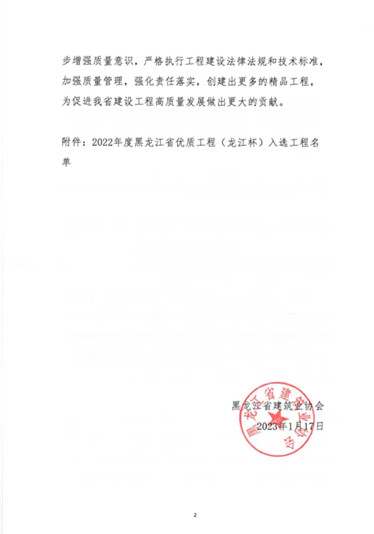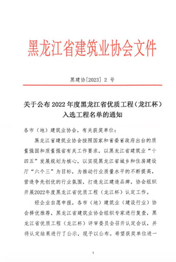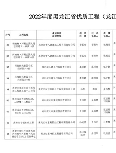 近日,黑龍江省建筑業(yè)協(xié)會發(fā)文《關(guān)于公布2022年度黑龍江省優(yōu)質(zhì)工程(龍江杯)入選工程名單的通知》,我公司承建的“松花江干流治理工程第十三標段”、“海林市斗銀水庫工程”赫然入選該名單之中。這是繼“牡丹江市東四跨江橋工程”之后,我公司再次榮獲“龍黑龍江省優(yōu)質(zhì)工程(龍江杯)”獎。